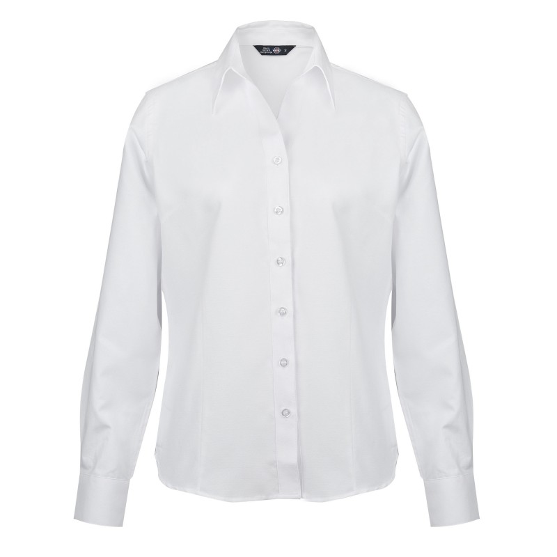 Blusa manga larga fabricada con tela Oxford teñida con alta calidad que garantiza la duración de su color, además de un acabado que facilita el lavado y planchado de la prenda. Brinda comodidad y estilo gracias a su calce lady y sus pinzas de entalle en busto y cintura que otorgan un look femenino y profesional.